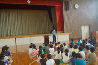 4年生が、三島市の下水汚泥などから作られている肥料について学びました。肥料を作っているアサギリの社長さんと三島市の浄化センターの職員の方が坂小に来てくださいました。三島市の汚泥の3分の2を肥料にかえていることを三島市の浄化センターの方に説明してもらいました。アサギリの社長さんから、肥料は、下水汚泥と牛ふん、料理の時に出た野菜くずなどを利用して作られていることの説明がありました。実際に4年生が理科の時間に育てたヘチマがものすごく大きくなり、それもこのアサギリの肥料の効果だと思われます。最後に大きくなったヘチマの前で記念撮影をしました。