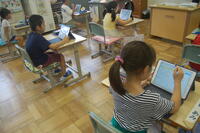 1年生算数「なんじ なんじはん」の授業の様子です。タブレット型端末を活用して時計の読み方を学習しました。教科書の問題とタブレット型端末を効果的に活用しました。