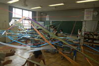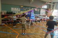 3年生図画工作「ひもひもワールド」の授業の様子です。いつも勉強をしている教室にひもとひもをつないで、教室がどんな感じに変わるのかをみんなでやってみました。いろいろな色を使って結んでいきました。できる形を想像しながら、つなぎ方も工夫しました。いつもの教室が大変身したことに子どもたちは大喜びでした。