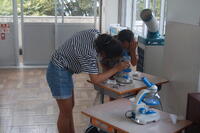 5年生理科の授業の様子です。顕微鏡の使い方を学びました。前の授業で、花の花粉などを見ました。今回は、学校の池の水をとってきて、どんな生き物がいるか観察してみました。緑っぽい植物みたいなもの、とうめいで動いているものなどを見つけることができました。タブレット型端末を活用し、顕微鏡で見えたものが何かを主体的に調べていました。