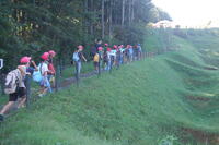 3・4年生が校外学習で山中城跡や箱根の石畳、みしまスカイウォークに行きました。坂地区にある旧東海道を実際に歩いたり、人気の施設を散策したりして学区をより知ることなどをめあてとしました。山中城跡では、特徴的な堀の形で、堀の中に土手状の畝を掘り残して区画し、上から見ると障子や田畑の畝のように見えることからそう呼ばれている「障子堀」や「畝堀」を見ました。