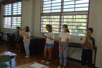 6年生が、外国語のスピーチテストを行いました。事前に質問内容を伝えられていたので練習を最初にしました。その後、廊下でALTの先生と1対1で行いました。緊張しながらも、しっかりと英語を使って答えることができていました。