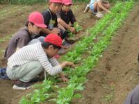 1,5,6年生が大根の種まきをしてからおよそ2週間。葉が大きくなってきたので、間引きをしました。初めて行う1年生に5,6年生がやさしく教えていました。どれを抜いたらいいか迷いながらも、上手にできました。間引いたものは、子供たちがおうちに持ち帰って、おいしくいただきます。