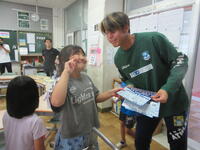 サッカーJリーグ「アスルクラロ沼津」の渡邊健太選手が訪問しました。プロのサッカーの試合を見に来てほしいことを放送し、2年生と一緒に給食を食べました。質問に、やさしく答えていただきました。サッカーの試合を見たいと言っている子供たちがたくさんいました。
