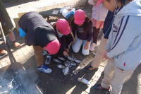 火をおこしたら、拾ってきていた枝に火をつけました。火がだんだんと大きくなって、その後落ち着いてきたら、事前にアルミホイルでまいてサツマイモを火の中に入れました。枯れ葉などを上にかけて、30分くらいサツマイモを焼きました。「やきいも」の完成です。できあがったやきいもは、とてもあまくて美味しかったです。