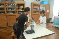 6年生「生き物と空気のかかわり」の授業の様子です。これまでの学習から「植物が酸素を出しているかどうか」の課題について実験を行いました。植物に袋をかぶせて息を吹き込みます。気体検知管を使って、袋の中の酸素と二酸化炭素の体積の割合を調べました。その後、約1時間、植物を日光にあて、再度気体検知管を使って袋の中の体積の割合を調べました。最初と1時間後では、酸素の体積の割合が増え、二酸化炭素の体積の割合が減っていることから、植物は、日光に当たると二酸化炭素を取り入れて酸素を出していることが実験を通して分かりました。