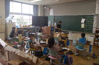 3年生書写の授業の様子です。筆の入り方、とめ、はらいなどに気をつけながら「木」を書きました。書写の授業は3年生からですが、お手本の字をよく見て一生懸命、丁寧に書いていました。