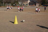 1・2年生体育「ボールけりゲーム」の授業の様子です。最初に一人1個ずつボールに触れて、ボールとなかよしになります。足の裏で右、左と交互にボールに触れてみたり、少しドリブルをしてみたりしました。その後、まとあてシュートゲームをしました。近いまとは1点、遠くになるにつれて点が高くなり、一番遠いところは5点のまとでした。それぞれ、自分でまとを選んでシュートゲームを楽しんでいました。まとに当たったときは、すごく嬉しそうでした。
