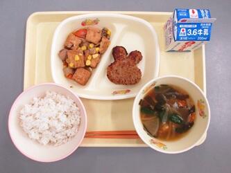 *牛乳*麦入りご飯*うさぎハンバーグ 照り焼き味*生揚げの五目煮*月見汁