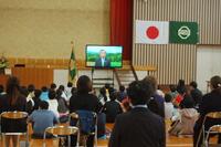 式典の中で、6年生児童のあいさつもありました。1年生から6年生までが笑顔で生活できるようになかよし活動(たてわり活動)を行っていること、地域も方々と協力して、じゃがいもやすいか、トウモロコシ、だいこん等の野菜をそだてていることなどの話がありました。そして、今回の切り絵講師である水口先生と一緒に全校児童で作成した150周年記念作品の披露もありました。
