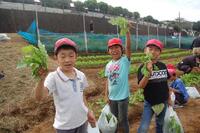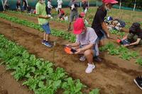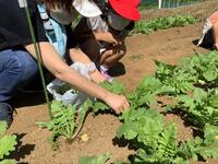 説明が終わった後、実際に「間引き」を行いました。苗がかなり大きくなっていたので、葉っぱ同士が少しからみ合っているので、一つずつていねいに行いました。特に1年生は、初めての「間引き」だったので、興味津々でした。うれしそうに、間引きしている姿がとてもかわいらしい1・2年生でした。一人約10本分のだいこんが収穫できそうです。楽しみです。