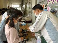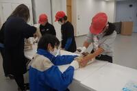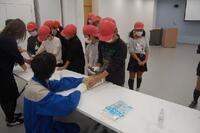 次に、自動車の組み立て工程で使用されている道具を見たりさわったり、安全靴をはいたり、作業着を着たりする体験をしました。安全靴のつま先の丈夫さに驚いていました。