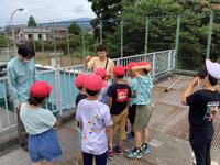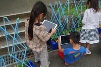 4年生が花壇に植えてあるヘチマの観察をしました。前回花壇に植えてからどれくらい大きくなったのか、写真を撮りました。「植えたときよりも少しつるが伸びている」「どれくらいおおきくなるのかな」など、タブレット型端末を活用することで前回に撮った写真と比較することができます。自分のヘチマが今後どのくらい生長するのかが楽しみのようです。福島交流から帰ってきたときにどれくらい生長しているのか分かるように印をつけておきました。