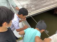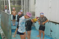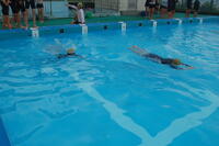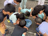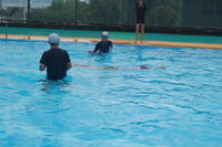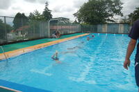 5・6年生、体育「水泳」の授業の様子です。雨の日が多かったので、今回が2回目の水泳の授業となりました。体操の後、シャワーを浴びて、プールに入りました。何回かもぐる練習をした後、ボール拾いをしました。ボールは人数分入れて、一人1個ボールを拾います。5年生、6年生どちらが早く全員拾うことができるか競争です。1回目は6年生、2回目は5年生が勝利しました。その後、けのび練習やバタ足の練習をしました。まずは、クロールで自己新記録が出るようにがんばってほしいと思います。