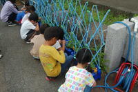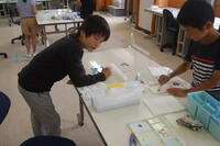3年生理科「トンボやバッタを育てよう」の授業の様子です。前回は、プールに行き、ヤゴを捕ってきました。今回は、学校の坂っ子山周辺や公民館周辺でバッタを捕まえに行きました。最初にかごにバッタのお家を作りました。土を入れたり、葉を入れたりして準備万端。後はバッタを捕まえに出発です。