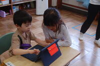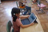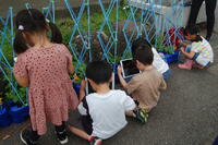 2年生のミニトマトに小さな実ができてきました。自分のミニトマトには、実ができているか一生懸命に探していました。「僕の実はすごく大きい」「僕のはたくさん実ができている」など、タブレット型端末で自分のミニトマトの生長を写真に撮っていました。教室に戻って、観察カードを書きました。