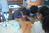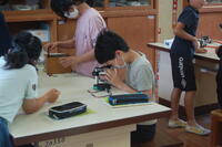 6年生理科の授業の様子です。植物のからだの水の通り道を調べてみました。最初に葉、茎、根のどの部分を水が通っているのかを予想してから行いました。その後、葉、茎、根の断面を切って、かいぼう顕微鏡を使って、観察しました。水の通り道がわかりやすいように赤色の実験用の色水を使ったので、どの部分に水の通り道があるのかがよく分かりました。
