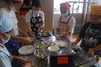 ゆでたジャガイモをつぶし、コロッケの形に丸めました。丸めたジャガイモにスライスしたジャガイモをつけて、油で揚げました。コロッケを揚げるのは、栄養士さんや支援員さんに手伝っていただきました。きつね色やきれいにコロッケが揚がっていきました。揚げたてのコロッケにお塩を少しふり、紙袋に入れて完成です。