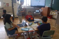 国語の教材「新聞を知ろう、作ろう」の発展的な学習として、「相手(読み手)にわかりやすい新聞をつくること」を目標に取り組んでいました。今回の読み手は、6月末に予定されている福島県猪苗代町立翁島小学校の皆さんです。子供たちは、タブレット型端末を効果的に活用して新聞づくりに励んでいました。Meta Mojiを利活用して作成した新聞を、画面上で共有しながら、お互いのよさを認め合ったり、改善点を指摘し合ったりして学びを深め、よりよい新聞に仕上げていました。タブレット型端末を効果的に活用すると、共有から交流へと対話が活発となり、子供たちの主体性(学びに向かう力)が育まれます。