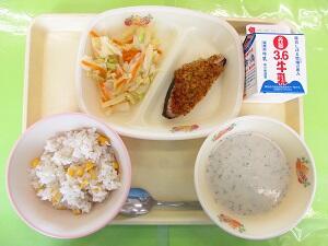 *牛乳*コーンライス*ぶりのマスタード焼き*野菜のソテー*ビシソワーズ