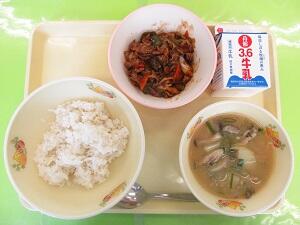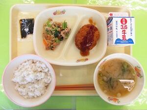 *牛乳*麦入りご飯*あしたかつ*納豆和え*みそ汁*浜名湖産のりの佃煮