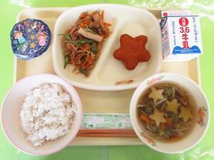 *牛乳*麦入りご飯*星型コロッケ*切干大根の煮物*お星さまのすまし汁*七夕三色ゼリー