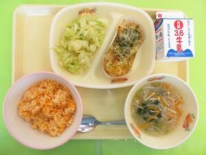 *牛乳*キャロットライス*ポテトのチーズ焼き*キャベツのカレーソテー*ジュリエンヌスープ
