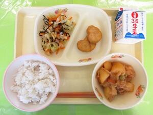 *牛乳*麦入りご飯*チキンナゲット*キャベツの塩こんぶ和え*肉じゃが