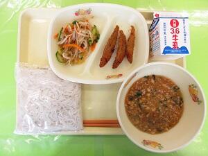 *牛乳*ソフトめん*きびなごフライ*千切り野菜のごま酢和え*ジャージャーめんソース