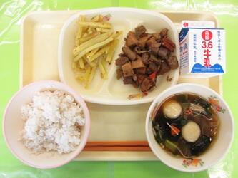 *牛乳*麦入りご飯*いわしのみりん干し*切り干し大根の煮物*春雨スープ*発芽玄米ふりかけ