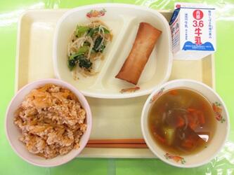 *牛乳*キムタクご飯*春巻き*もやしのさっぱり和え*ポテトスープ