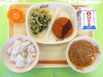 *牛乳*麦入りご飯*キャベツ入りメンチカツ*ごま和え*みそ汁・みかん