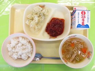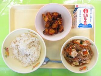 *牛乳*麦入りご飯*豆腐ともやしの中華煮*大学芋