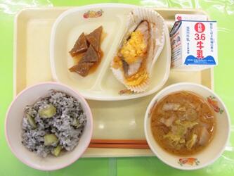 *牛乳*さつまいもご飯*ぶりのマヨコーン焼き*味噌田楽*みそ汁
