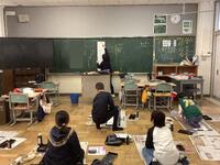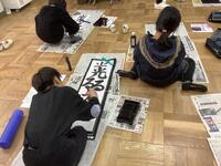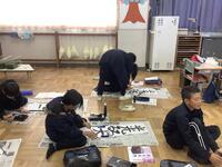 5年生国語(書写)の授業です。書き初めの練習をしました。普段は机の上で書きますが、長い半紙を広げるため床でやります。先生が書き方のポイントを伝え、書き始めました。筆も太いので難しい様子でしたが、力強い字が書けました。