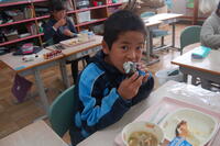 給食週間2日目。今日のメニューで「おむすび」「やきのり」「さけのしおこうじやき」「たくあん」「ぐだくさんじる」「ぎゅうにゅう」でした。とくに「おむすび」は自分でのりを巻いたり、さけやたくあんの具をおむすびに入れたりして、オリジナルおむすびを作って楽しみました。どの子もおいしそうにおむすびを頬張る姿がとてもかわいらしかったです。明日の給食もまた楽しみです。