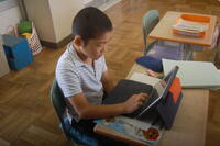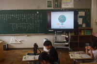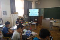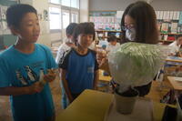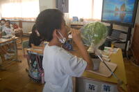 6年生理科「生物と空気との関わり」の授業の様子です。これまでの学習から「植物が酸素を出しているかどうか」の課題について実験を行いました。植物に袋をかぶせて息を吹き込みます。気体検知管を使って、袋の中の酸素の体積の割合を調べました。その後、約30分間植物を日光にあて、再度気体検知管を使って袋の中の体積の割合を調べました。最初と30分後では、酸素の体積の割合が増えていました。このことから、植物は、日光に当たると酸素を出していることが実験を通して理解することができました。