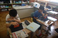 5年生が夏の自由研究について、何に取り組もうか考えました。最初に「調べたいことを見つける」。次に、これまでの学習してきたことや経験などから「どうなるか予想する」。そして、「予想をもとに計画を立てる」最後に、実験や調べたことを「まとめる」という流れで進めることを確認しました。その後、これまで理科の学習で学んできたことなどをいろいろと振り返りながら、じぶんがやってみたい、調べてみたいテーマを考えていました。
