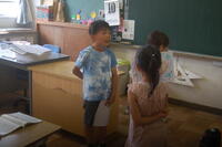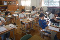 2年生国語「あったらいいな、こんなもの」の授業の様子です。これがあると便利だなと思うものを考えて、絵にあわらして、友達に説明しました。「ジャンプしたら、思った場所に着くシューズ」「瞬間移動できる入れ物」「スイッチを押すとその場所に移動できる地図」「触ると増える手袋」「何でも想いがかなうステッキ」「自動で駐車してくれる車」など、たくさんのアイデアが出てきました。友達に上手に伝えることができました。