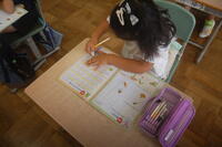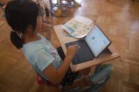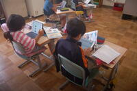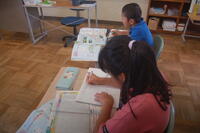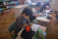 5年生「食べ物の主な産地は、どのようなところだろうか」の課題について、調べてまとめていました。お米や野菜、みかん、柿、マンゴー、りんごなど日頃から自分たちがよく食べている食べ物の産地について調べ、ノートにまとめていました。