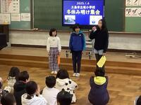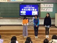 2、4、6年生の代表児童からは、今年頑張りたいことを全校児童の前で発表がありました。「漢字の勉強を頑張りたい」「かけ算九九をしっかりと覚えたい」「お手伝いをしっかりやりたい」「下級生のお手本となるような行動をしたい」「優しい言葉をたくさん使うなど、言葉遣いに気をつけていきたい」「いろいろなことにチャレンジしていきたい」など、堂々と発表することができました。教室に戻ってからは、どの学年も新年の目標を立てている様子が見られました。気もちを新たに、自分の目標に向かって頑張ってほしいと思います。