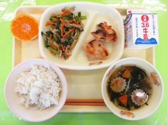 *牛乳*ご飯*鶏肉の甘麹みそ焼き*小松菜の煮浸し*富士山なるとのすまし汁*みかん