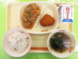 *牛乳*麦入りご飯*焼き栗コロッケ*大根のそぼろ煮*わかめスープ