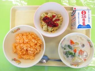 *牛乳*キャロットライス*じゃがいも入りスクランブルエッグ*坂さつまいものクリームスープ