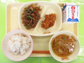 *牛乳*麦入りご飯*鶏肉のハニーマスタード*彩りこんにゃく炒め*みそ汁