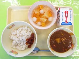 *牛乳*麦入りご飯*チキンカレー*福神漬け*白玉サイダーポンチ