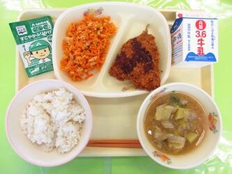 *牛乳*麦入りご飯*あじフライ ソース*にんじんしりしり*みそ汁*のりふりかけ