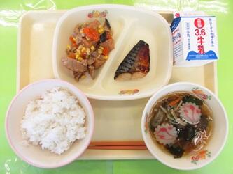 *牛乳*ご飯(有機米)*さばの塩麹焼き*生揚げの五目煮*沢煮椀