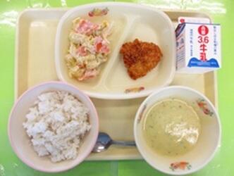 *牛乳*麦入りご飯*米粉のササミカツ*冬味ポテトサラダ*さつまいものポタージュ