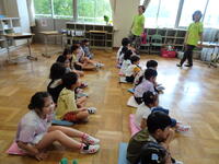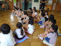 境川の周辺で、虫探しをしました。バッタ、トンボなど、たくさんの虫と出合うことができました。カエル探しに夢中になっている子もいました。また、トンボが産卵する様子を間近で見たときは、歓声が上がりました。